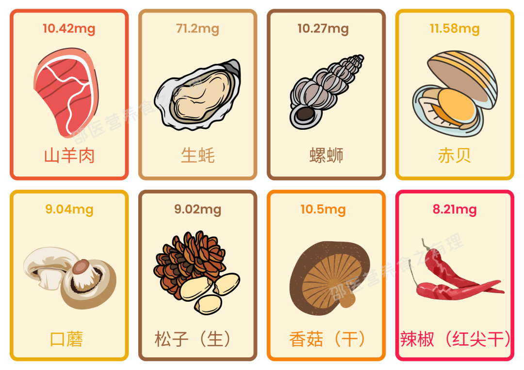 贝壳类海产品、红色肉类、动物内脏都是锌元素的良好来源;其中以生蚝的含锌量最高;植物性食物豆类、谷类、蔬菜和水果含锌量较低。