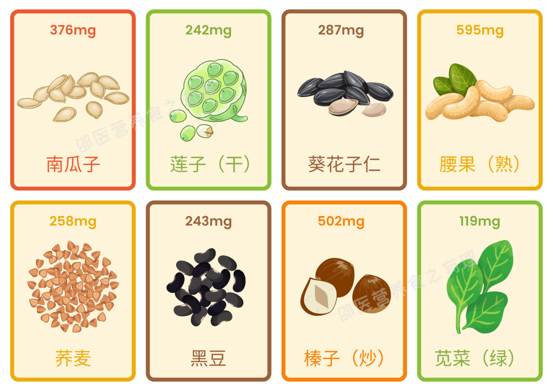 镁元素广泛存在于食物中,其中粗粮、坚果含量较为丰富,肉类、淀粉类食物、牛奶的含量较少。