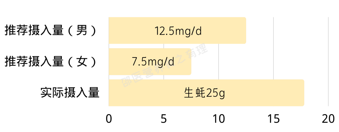 ● 摄入生蚝25g即可达到锌的每日推荐摄入量。