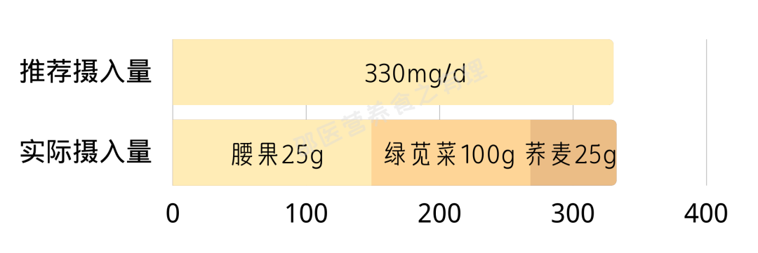 ● 摄入腰果25g+绿苋菜100g+荞麦25g即可达到镁的每日推荐摄入量。