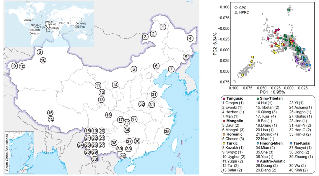 cpc一期核心样本地理分布及语系、族群、遗传聚类关系