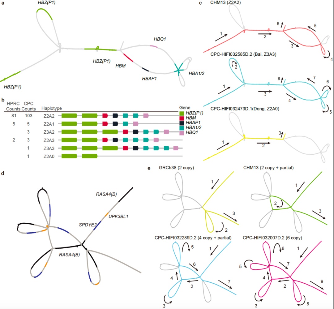 cpc泛基因组图谱作为首个中国人群专属的泛基因组参考图谱,与hprc泛基因组图谱相比,在中国人群特有的复杂变异解析方面具有显著优势。cpc泛基因组图谱中新发现了1079个基因拷贝数变异,以及包含药物代谢基因cyp2d6等在内的在中国人群中富集而在其他世界人群中出现频率较低的若干基因拷贝数变异;新鉴定出富集在中心粒、端粒等染色体复杂区域的3.4万个结构变异,其中半数以上仅在单个或两个样本中出现——若不针对中国丰富的族群多样性开展专门研究,将没有机会发现这些遗传变异。研究人员进一步揭示,这些cpc新发现的遗传变异可能与亚洲人群特有的疾病易感性及表型多样性有关。一个典型的例子是α-珠蛋白基因簇,研究人员在该基因区域鉴定出两个中国人群特异性的大规模结构变异,包括一段20kb的缺失序列和一段10kb的重复序列,这将为进一步研究中国人群贫血症的遗传机理和致病机制提供新的线索。