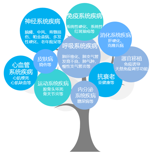间充质干细胞治疗涉及200种适应症,8大系统疾病,譬如在呼吸系统、神经系统、内分泌系统、运动系统、免疫系统、生殖系统、循环系统以及消化系统等多系统领域均有成功案例报道。