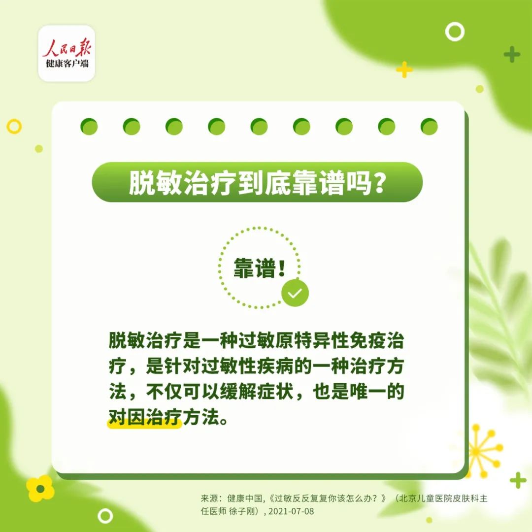 靠谱!脱敏治疗是一种过敏原特异性免疫治疗,是针对过敏性疾病的一种治疗方法,不仅可以缓解症状,也是唯一的对因治疗方法。④