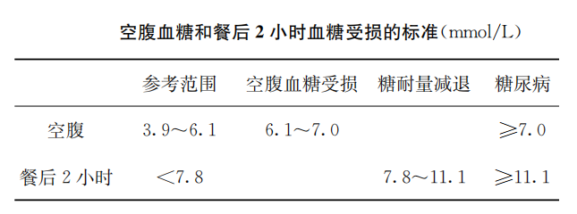 注意:空腹血糖和餐后2小时血糖受损的标准见下表。