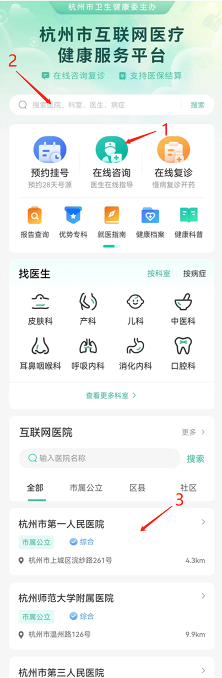 3. 首页向下滚动至互联网医院列表,选择医院—科室—医生。