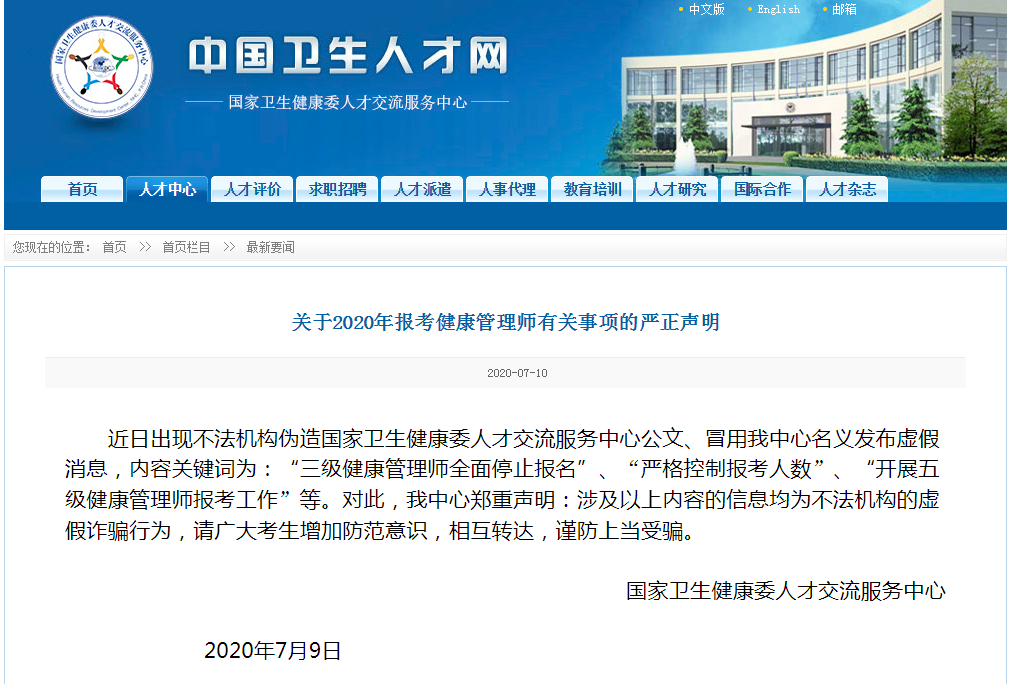 健康管理师报名火热,报名机构也繁杂众多,进来不少无良机构假借卫健委名义,通过P图等行为宣传不实信息,为了澄清事实,中国卫生人才网特意发布《关于2020年报考健康管理师有关事项的严正声明》,特别提出“三级健康管理师全面停止报名”、“严格控制报考人数”、“开展五级健康管理师报考工作”等均为虚假信息!