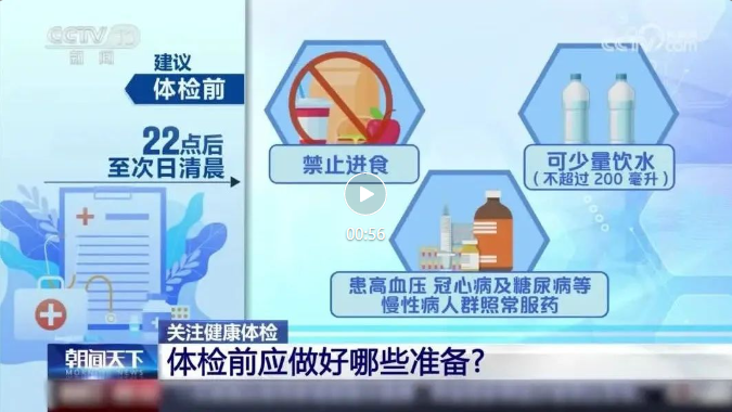 体检前1天22点后至次日清晨禁止进食,可少量饮水(不超过200毫升),患高血压、冠心病及糖尿病等慢性病人群照常服药。
