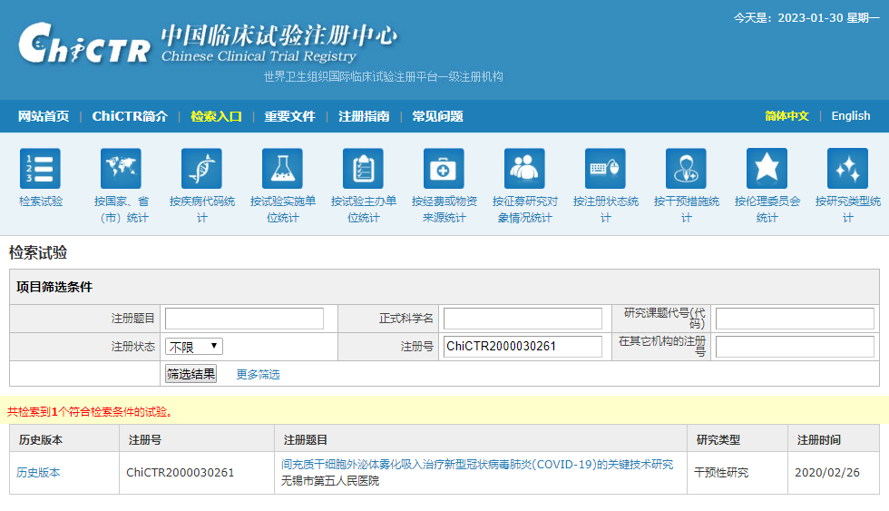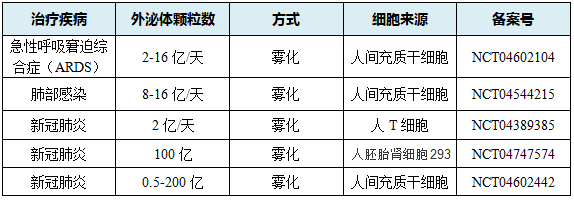 在中国临床试验注册中心登记注册的《间充质干细胞外泌体雾化吸入治疗新型冠状病毒肺炎(COVID-19)的关键技术研究》项目(ChiCTR2000030261),其目的是利用干细胞外泌体的抑制炎症因子和增强机体免疫力的作用,通过雾化吸入肺直接接触病灶的方式,促进新冠病毒肺炎患者早日康复,减少并发症。