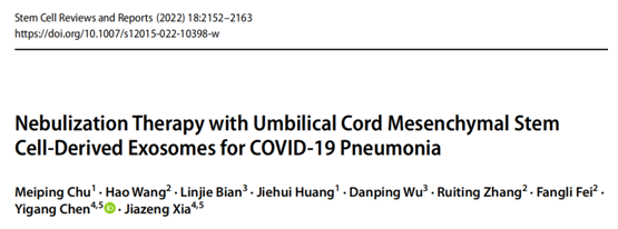 以上临床试验成果于2022年发表在《Stem Cell Reviews and Reports》杂志(2022年影响因子6.692)。研究人员对7例新冠肺炎患者(2名重症、5名轻症)进行了脐带间充质干细胞(MSCs)外泌体雾化治疗试验,结果表明:干细胞来源的外泌体雾化治疗新冠肺炎安全可行,同时MSC外泌体雾化治疗可以促进肺部病变的吸收,并缩短轻度新冠肺炎患者的住院时间。除此之外,在感染早期对MSC衍生的外泌体进行雾化治疗可能对患者更有利。