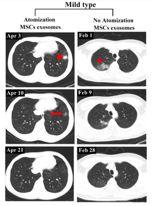 雾化的MSC来源的外泌体可以到达肺部的精细结构,如细支气管和肺泡,以直接将抗炎分子递送到它们的靶位。雾化吸入MSC来源外泌体不会诱发急性过敏反应或继发性过敏反应,同时促进肺部病变的吸收,并减少轻度新冠肺炎患者的住院时间。