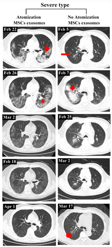 该项试验的结果表明,在参与受试的COVID-19患者中,雾化吸入间充质干细胞衍生的外泌体是可行的,并且耐受性良好,没有预先指定的不良事件的证据。参与者的肺部炎性症状,得到了不同程度的改善。