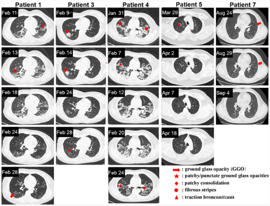 ▲患者1、3、4、5和7的胸部CT图像
