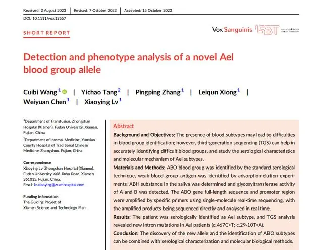 文章很快在国际输血医学期刊《Vox Sanguinis》杂志在线发表,吕小英副主任为通讯作者,王翠碧技师为第一作者。此后,新发现的A等位基因变异体被国际输血协会ISBT以“复旦大学附属中山医院(厦门)输血科”命名。同时,该研究还获得了厦门市医疗卫生指导项目的资助,该例新等位基因的发现,不仅刷新了人们对血型基因的认知,也进一步提高了临床输血安全系数。