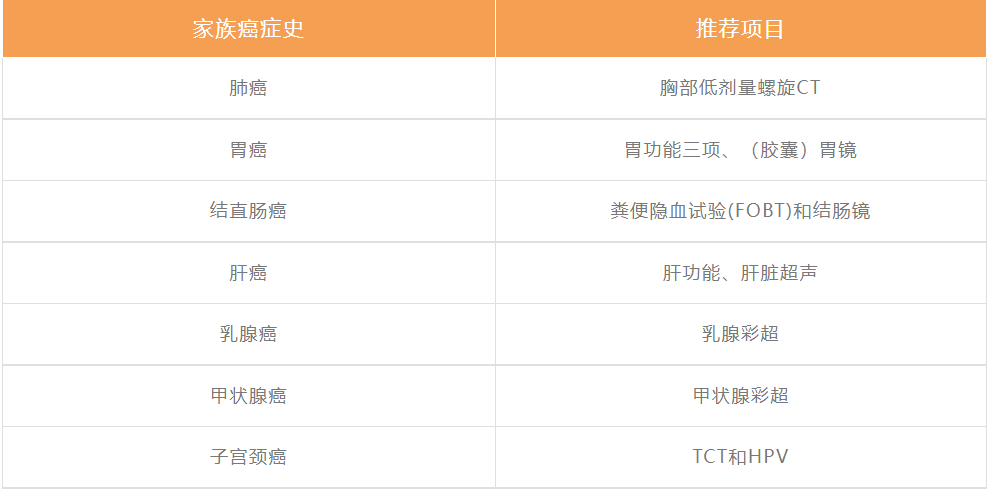 由于癌症通常有一定的遗传倾向,比如说长辈得癌症了,那么晚辈的癌症发病率是要比一般人高一些的。因此,建议有癌症家族史的人群要更加留意癌症相关的检查,可参照下表: