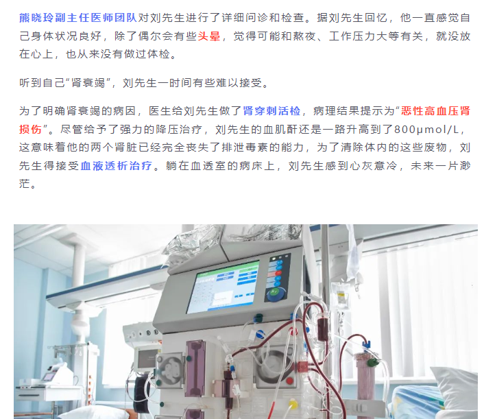刘先生被安排输注了降压的盐水,血压才慢慢趋向平稳,并因“急性肾功能衰竭”紧急收入肾内科病房。