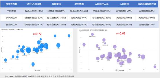 分析发现,地方居民平均寿命与CMH人均药品消费、保健支出、卫生费用、人均医疗技术人员呈正相关关系,而与综合环境指数并无相关性。