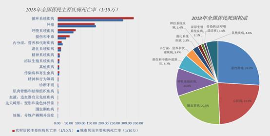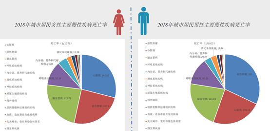 其中男性第一死因是恶性肿瘤,女性第一死因是心脏病。男性发病率前三的恶性肿瘤是肺癌、胃癌和肝癌;女性发病率前三的恶性肿瘤是乳腺癌、肺癌和结直肠癌。
