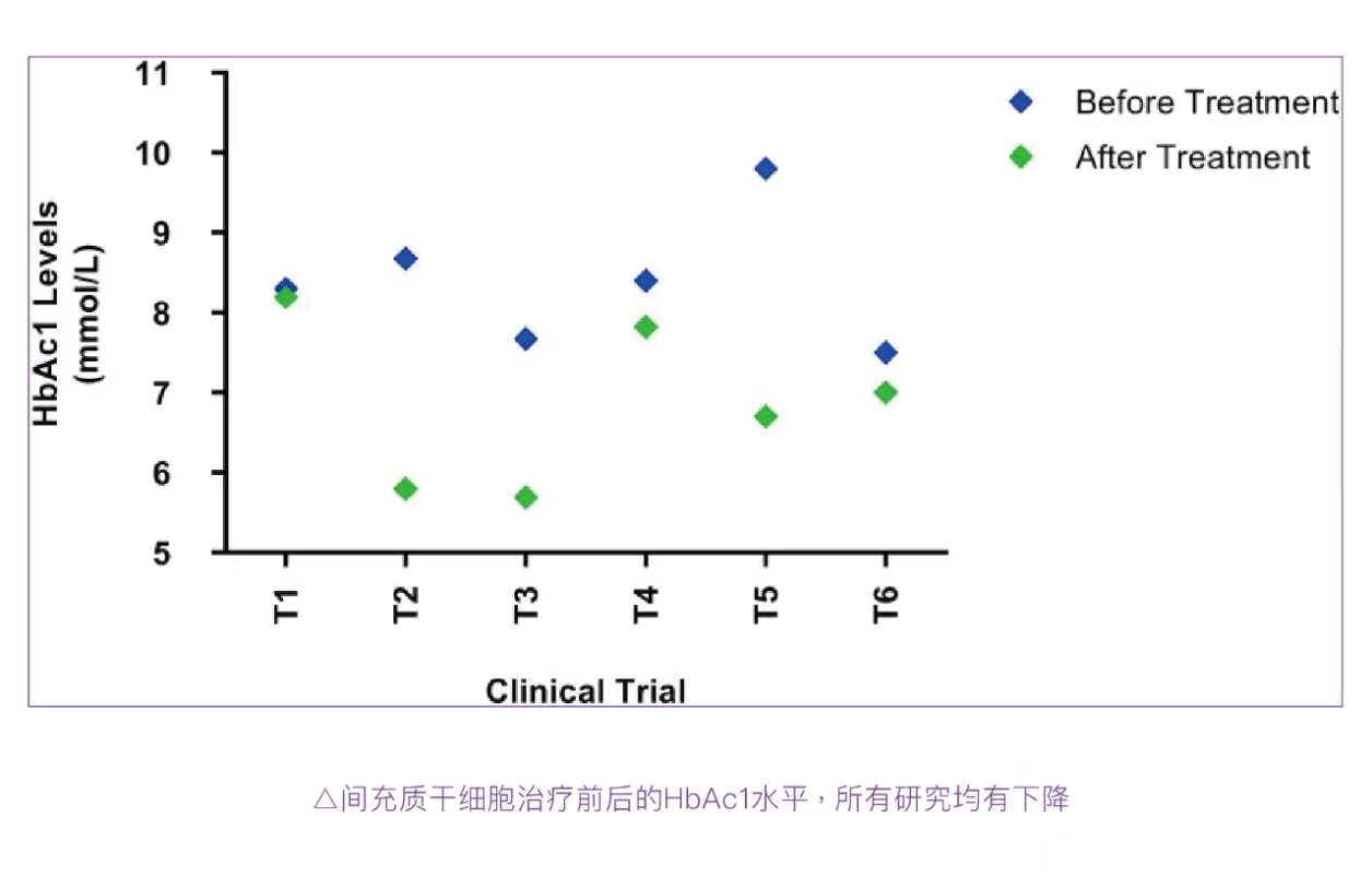 △间充质干细胞治疗前后的HbAc1水平,所有研究均有下降