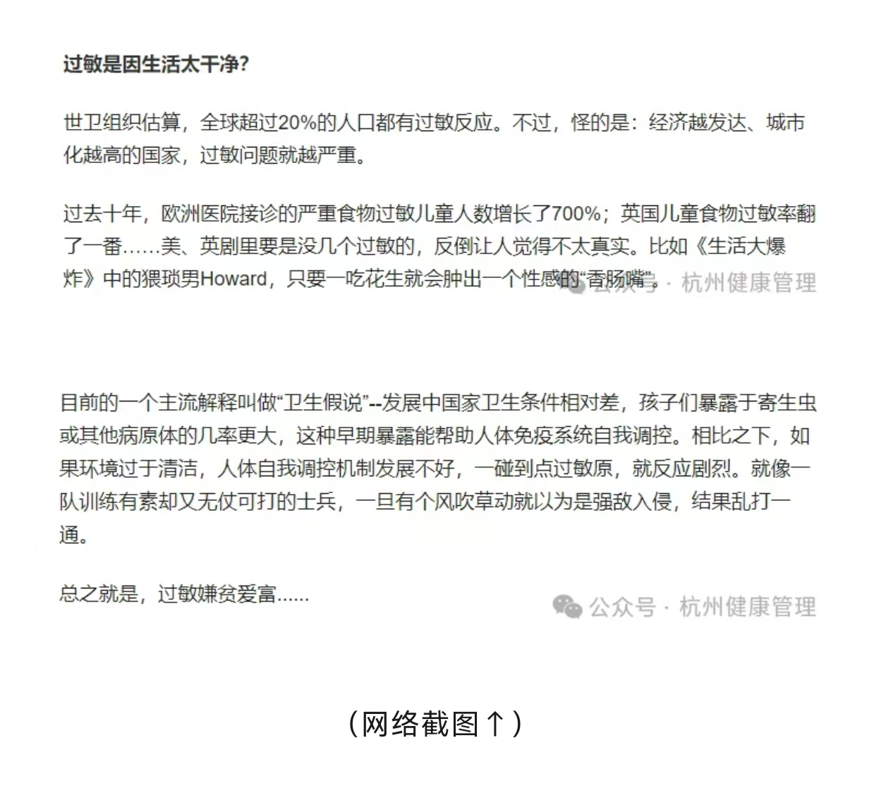 理解:“干净”是一个视觉冲击,饮食的干净和实体环境的干净是不同的吧?身体的“卫生”应该是一个身体微生态平衡(应该也包含皮肤及周围),才好吧?也不能像环卫工作那样地去理解。人体过敏现象启动的又是身体的免疫系统,而免疫系统就是抵御抵抗疾病的主要功能,免疫系统常常被忽左忽右的乱指挥,关键是身体受不了呀,再接下去理解呢?…