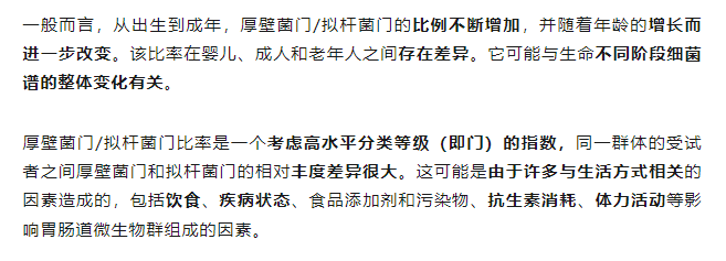🍃厚壁菌门与拟杆菌门的比例:研究发现,肥胖个体的肠道中厚壁菌门的细菌比例相对较高,而拟杆菌门的细菌比例则相对较低。相反,在瘦削个体的肠道中,拟杆菌门的细菌比例较高,而厚壁菌门细菌则相对较少。厚壁菌门和拟杆菌门的比例(F/B ratio)能反映肠道菌群帮助身体吸收热量的能力。