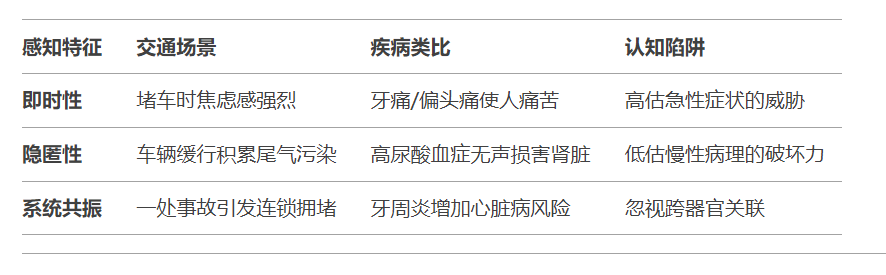 交通拥堵是即时反馈系统(车流变化每分钟可见),而疾病发展可能是数十年累积的结果。