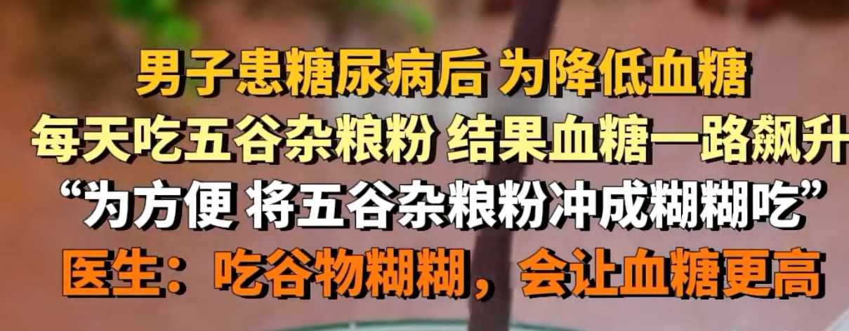消息引用“男子患糖尿病后为降低血糖每天吃五谷杂粮粉结果血糖一路飙为方便 将五谷杂粮粉冲成糊糊吃医生:吃谷物糊糊,会让血糖更高,或者是煮得特别烂。