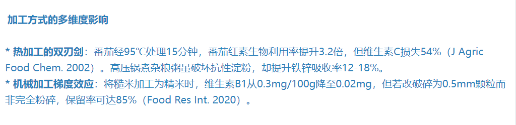 :过度加工会使维生素B₁(留存率从85%降至60%)、膳食纤维(从12g/100g降至8g/100g)等热敏性营养素流失。 - 饱腹感阈值改变