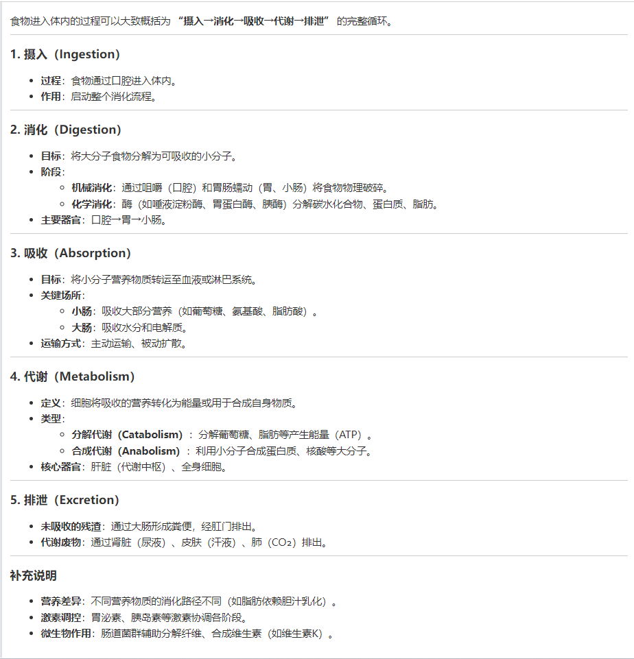 食物进入体内的过程示意:“摄入→消化→吸收→代谢→排泄”↓