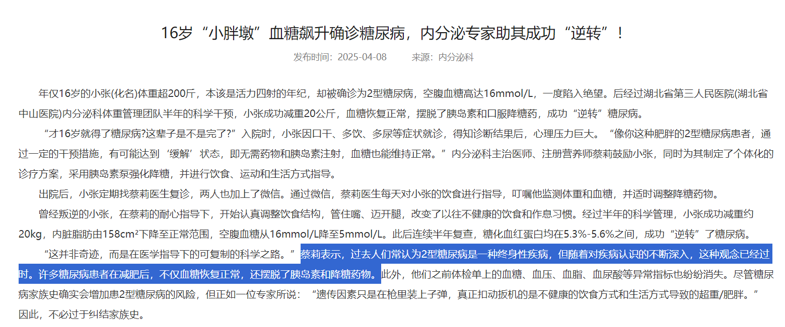 “才16岁就得了糖尿病?这辈子是不是完了?”当16岁的小张被确诊为2型糖尿病,空腹血糖高达16mmol/L时,他一度陷入绝望。但经过湖北省第三人民医院内分泌科体重管理团队半年的科学干预,小张成功减重20公斤,血糖恢复正常,摆脱了胰岛素和口服降糖药,实现了糖尿病的“逆转”。
