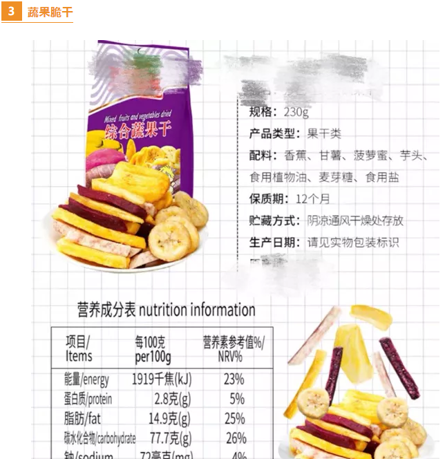虽然与传统加工工艺相比,这种方式大大减少了油的使用量,但无论如何,只要是油炸食品,就一定会带来额外的油脂摄入,可以看到配料表中还有植物油、麦芽糖和食用盐。而经过计算,可以发现该示例零食中脂肪的能量可占总能量的30%左右,其中的碳水化合物含量也相当高。