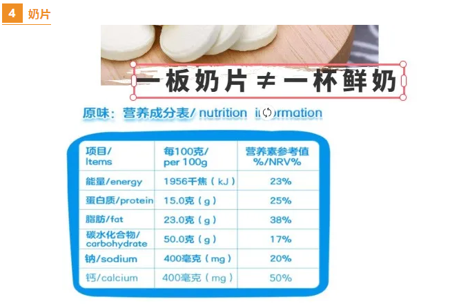 真是如此吗?让我们计算一下:一盒250ml某知名品牌纯牛奶的蛋白质含量约为9g、碳水化合物总量12.5g,一片奶片蛋白质含量仅为0.3g。想要通过奶片补充蛋白质,相当于需要吃30片奶片才抵得上一盒该品牌牛奶的蛋白质含量,吃掉30片奶片的同时,糖的摄入量也大大增加了。