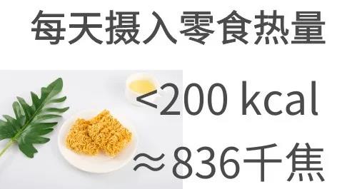 每天零食的热量以不超过200大卡为宜,200大卡换算后相当于836千焦。尽量在两餐之间或饭前吃;若吃零食的量比较大,要适当减少正餐的用量。